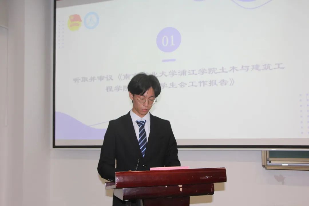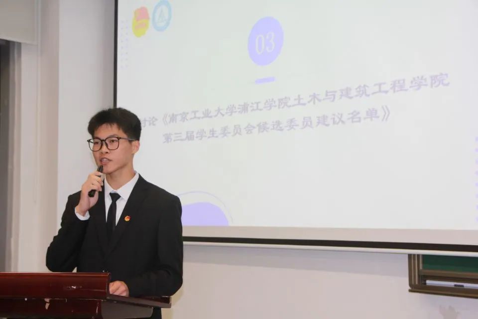 大會主持人林銳同學(xué)為大家宣讀《南京工業(yè)大學(xué)浦江學(xué)院土木與建筑工程學(xué)院第三屆學(xué)生委員會候選委員建議名單》,經(jīng)全體代表審議表決,鼓掌通過