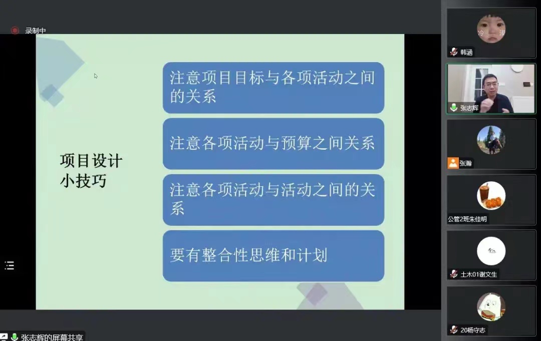 同時,張志輝老師還通過圖表的形式向我們直觀地介紹了邏輯框架的運用,以不同的具體實例為總目標,使同學們更好地感受邏輯思維的重要性。在邏輯框架中,我們可以了解到總目標與效益、指標、產(chǎn)出、活動的聯(lián)系。談及開展公益項目,張志輝老師提到,項目目標的設定與考量尤為重要。他從結(jié)果目標與過程目標兩個方面,列舉多個案例并進行分析,從而總結(jié)出項目設計的技巧:1、注意項目目標與各項活動之間的關(guān)系 2、注意各項活動與預算之間的關(guān)系3、注意各項活動與活動之間的關(guān)系4、要有整合性思維和計劃。