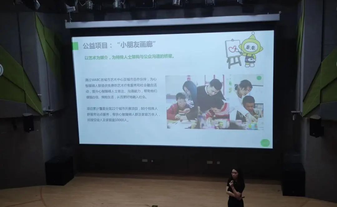 WABC致力于以藝術(shù)療愈的方式幫助心智障礙群體獲得社會的接納與尊重,從而促進社會的包容性。其策劃的”小朋友畫廊”公益籌款項目刷爆朋友圈,將心智障礙這個特殊群體及其背后的公益組織帶入大眾視野。講座伊始,王濤老師為我們介紹了”小朋友畫廊”這一現(xiàn)象及事件背后的故事,從設(shè)計、發(fā)到反饋,既是深耕了八年的積淀體現(xiàn),也有著難以復(fù)制的偶發(fā)性。緊接著,王濤老師從起源、成立、發(fā)展等幾方面帶我們走近了上海藝途公益基金會(WABC)。其中,WABC核心項目板塊由專業(yè)支持、公眾倡導(dǎo)、公益項目、衍生產(chǎn)品四部分構(gòu)成。其中小朋友畫廊作為品牌公益項目的重要一塊,成為了特殊人士架構(gòu)與公眾溝通的重要橋梁。