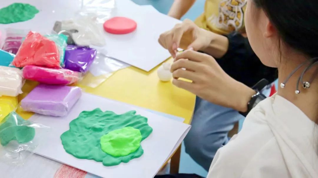 趣味手工課分為手工繪畫和粘土制作兩個部分,首先小豬老師為大家介紹了制作的材料以及制作步驟,并將手工繪畫的主題命為“我心中最美的風(fēng)景”,小朋友們紛紛講述自己心中最美的風(fēng)景——有落日余暉,有大海,有和爸爸媽媽出去玩時見過的美景……接著來自藝術(shù)學(xué)院的小李老師在黑板上為小朋友們示例了繪畫內(nèi)容和粘土制作,小朋友們充分發(fā)揮自己的想象力,開始完成自己的繪畫作品并用粘土豐富畫面
