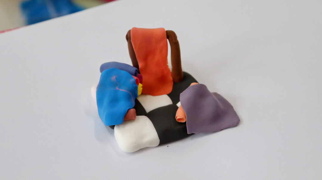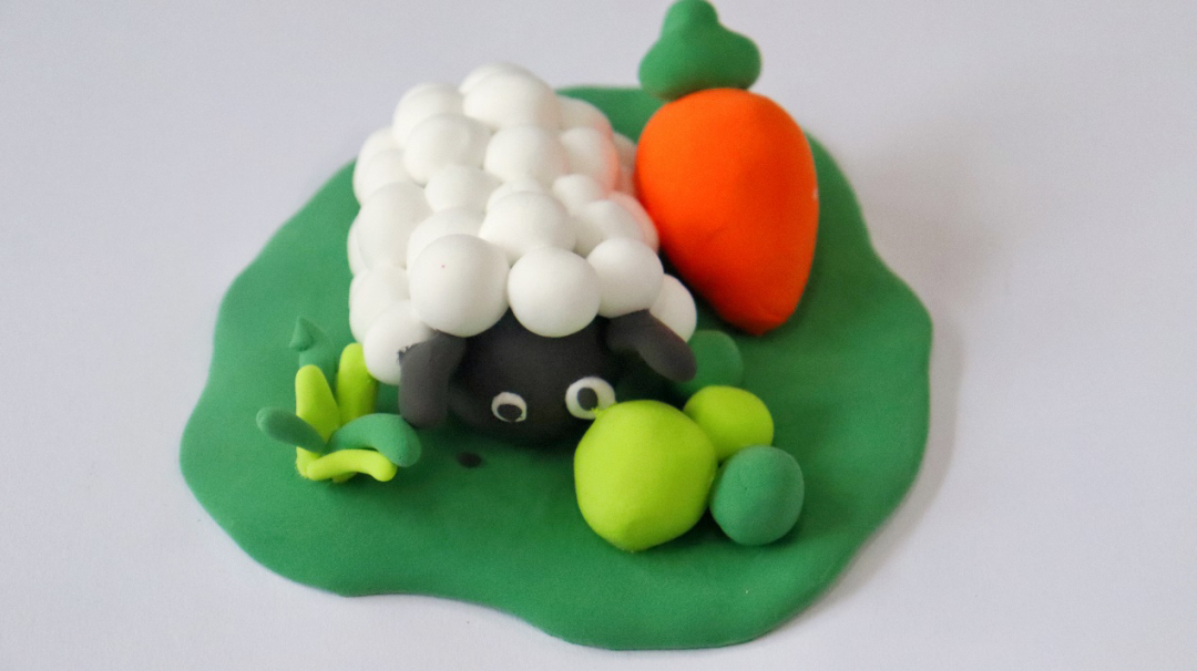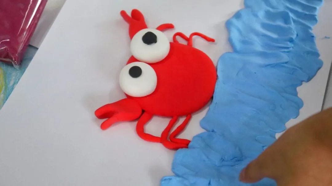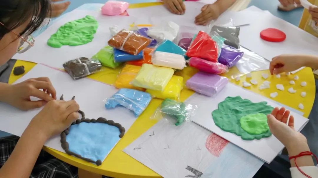 經(jīng)過將近一小時的制作,小朋友們用手中五顏六色的粘土和蠟筆創(chuàng)作出一幅幅充滿童趣的作品。