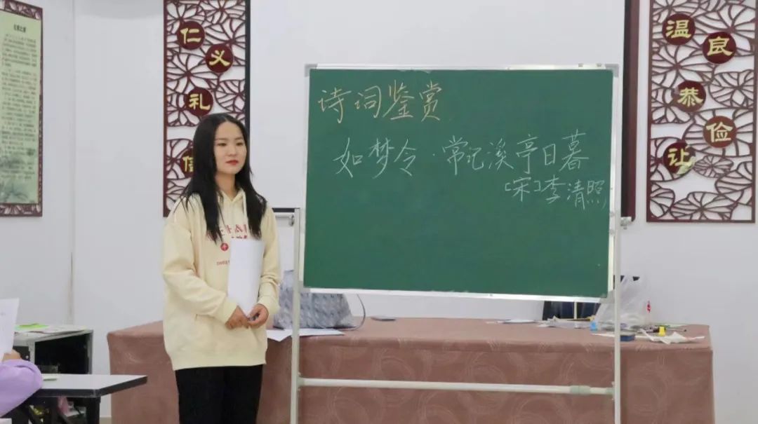本次詩詞課鑒賞的是李清照的《如夢令 常記溪亭日暮》。小桐老師逐字逐句地為小朋友們講解,將詞中所描寫的日暮晚景與李清照的平生雅事娓娓道來:“李清照外出與好友聚會,吟詩作樂,推杯換盞,好不快活……”