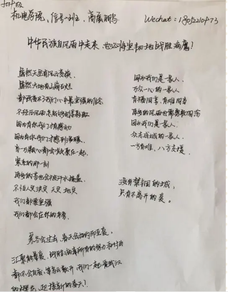 疫情的發(fā)生阻斷了我們的腳步,卻阻斷不了愛。不是為感動(dòng)誰,只是想借此表達(dá)自己的一些感受,但愿這幾行文字能帶來些正能量,沒有在作品最后落下姓名,因?yàn)榇丝涛乙仓皇且幻麨槲錆h加油,為中國(guó)加油的普通市民。讓我們一起期待寒冬的結(jié)束,共同擁抱春暖花開。