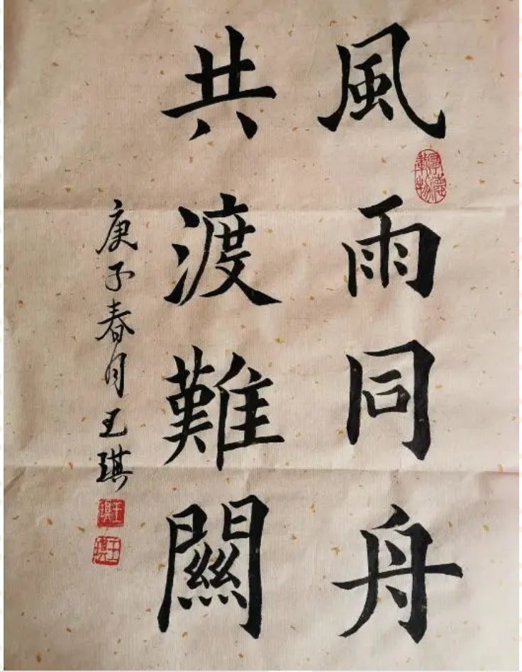 2020年庚子鼠年伊始,中國(guó)武漢新型冠狀病毒感染的肺炎疫情就來勢(shì)洶洶,牽動(dòng)了中華人民的心,許多有能力的人紛紛獻(xiàn)出了自己的力量,捐贈(zèng)了物資。中國(guó)是一個(gè)大家庭,有著團(tuán)結(jié)拼搏的優(yōu)良傳統(tǒng)。此時(shí),我也在心中默默祝愿中國(guó)能過度過這次難關(guān),于是寫下:“風(fēng)雨同舟,共渡難關(guān)”。讓我們藝起戰(zhàn)役,武漢必勝,中國(guó)必勝!